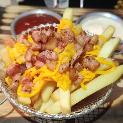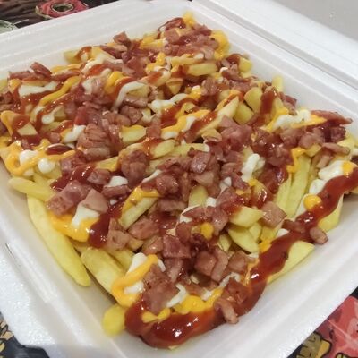 | 300g de batata, temperadas com sal, coberta de Cheddar Polenghi e bacon. Enviado