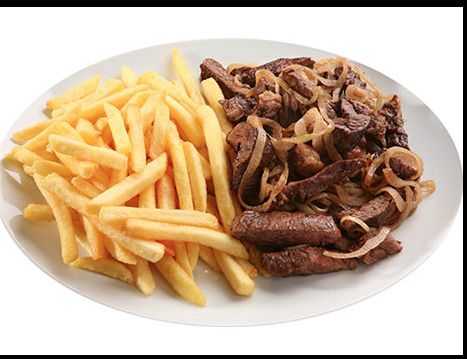 | 300g de Contra filé em iscas feito na chapa com tempero da casa, 300g de batatas